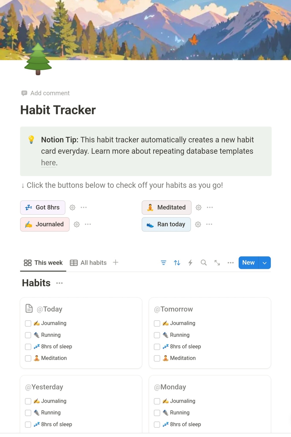 Boost your consistency with this smart Notion Habit Tracker! It auto-generates daily habit cards, lets you tick off completed tasks with one click, and keeps you motivated with a clean, interactive design that makes habit-building fun and easy.